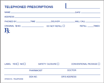 RX Telephone Prescription Pads available in Blue or Green on White Bond